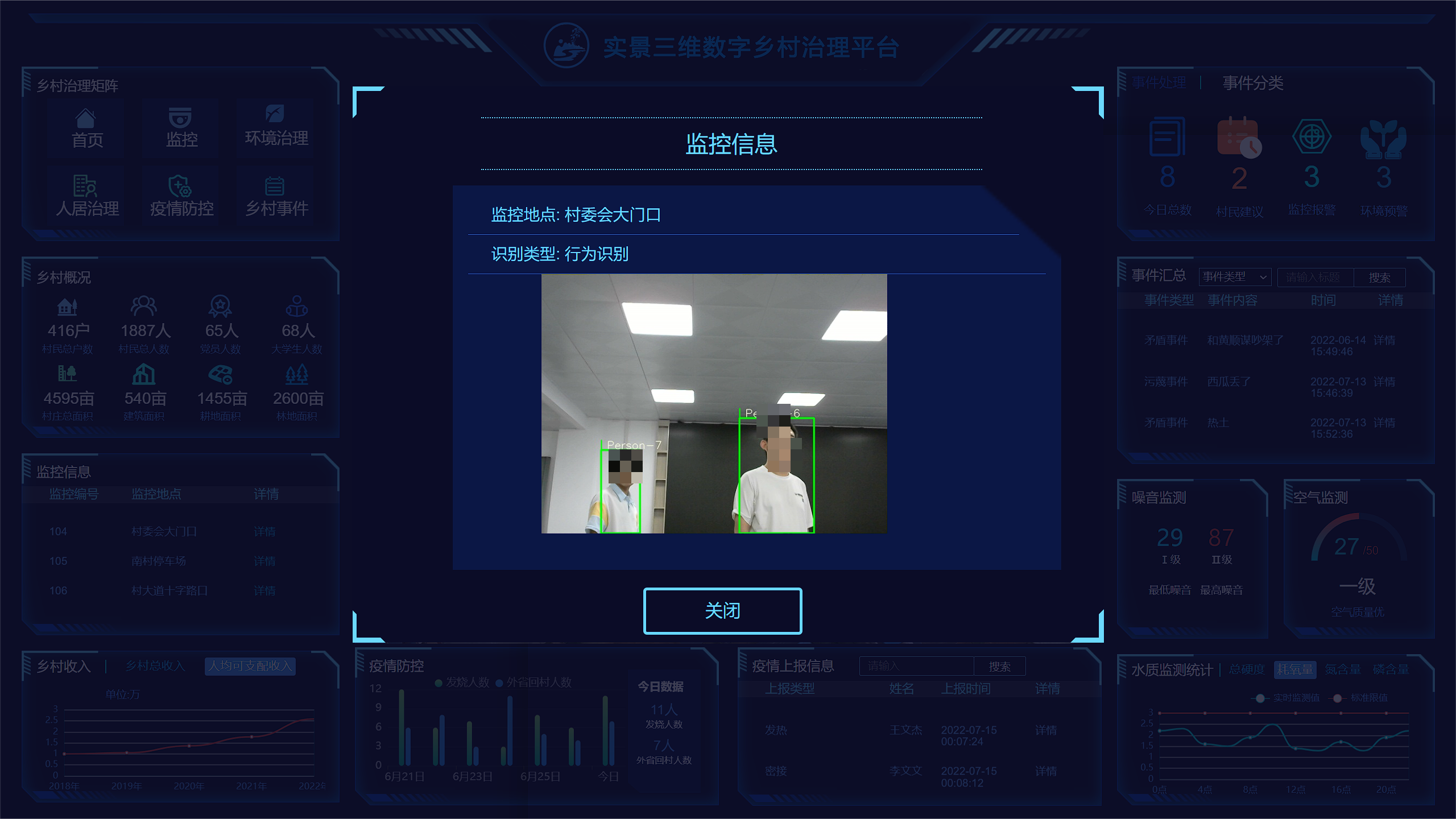 系统利用物联网技术,实时获取监控摄像信息,并将其存储在后台中, 同时,使用事先训练好的YOLOv5单阶段目标检测算法可对监控信息进行识别,当监测到有非法闯入、非法停靠、违章乱建等违规事件的发生后,系统会自动报警。村民在日常生活中,如遇紧急突发情况,可使用微信上报突发事件,系统接收到相应紧急事件后可进行报警,使管理员可以迅速了解紧急情况并作出对应决策。